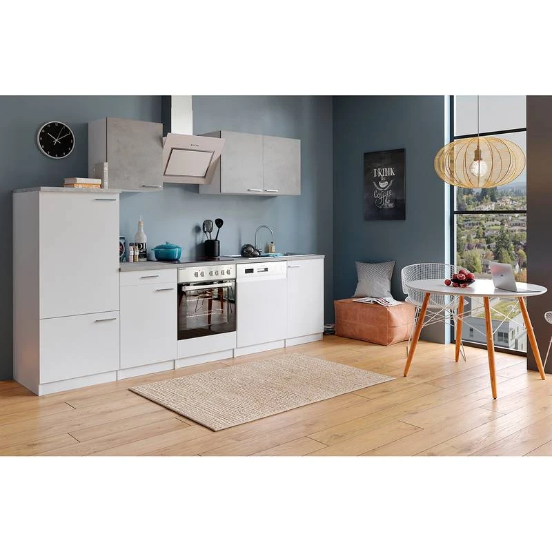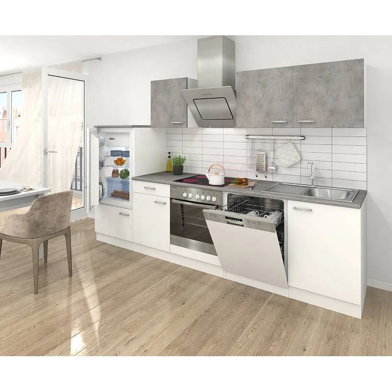 - Électroménager inclus : 1 four encastrable, 1 plaque vitrocéramique, 1 réfrigérateur encastrable , 1 lave-vaisselle encastrable et 1 hotte aspirante inclinée