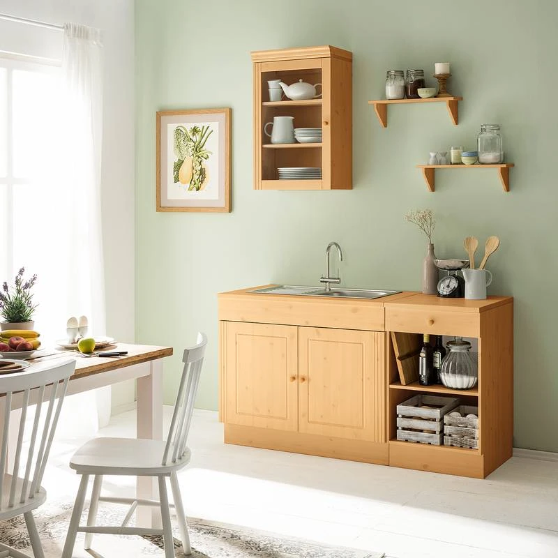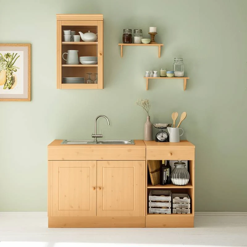 - Cuisine équipée incluant 1 meuble haut, 2 étagères murales, 1 meuble avec évier et 1 meuble bas