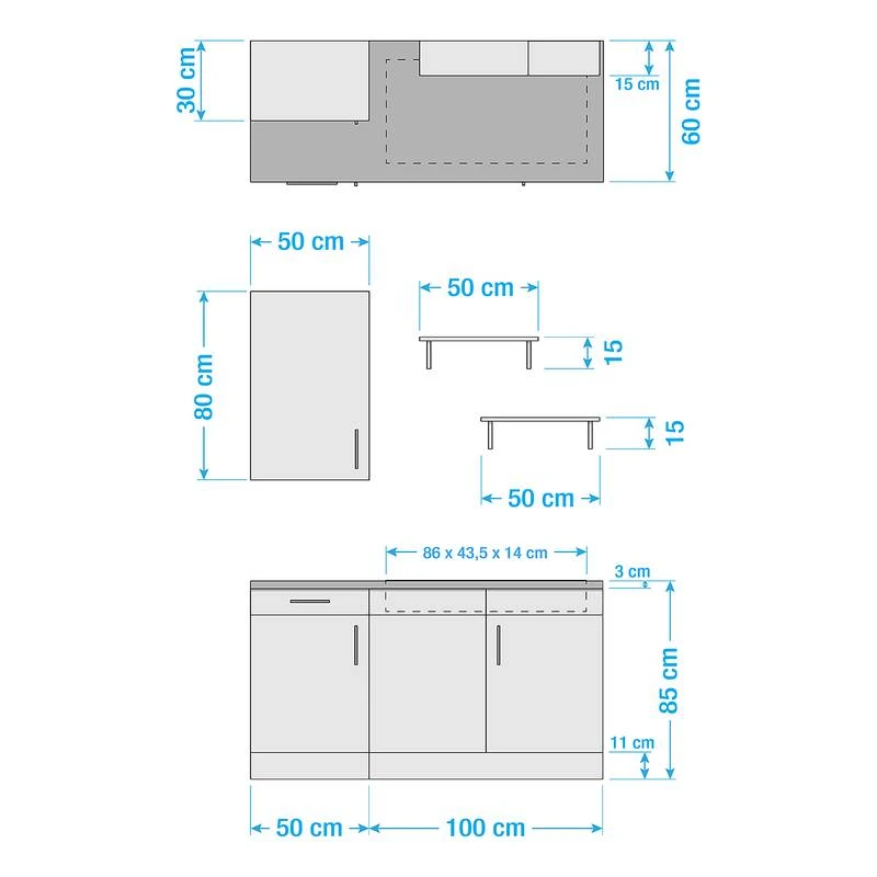 - Meuble avec évier (LxHxP) : 100 x 85 x 60 cm