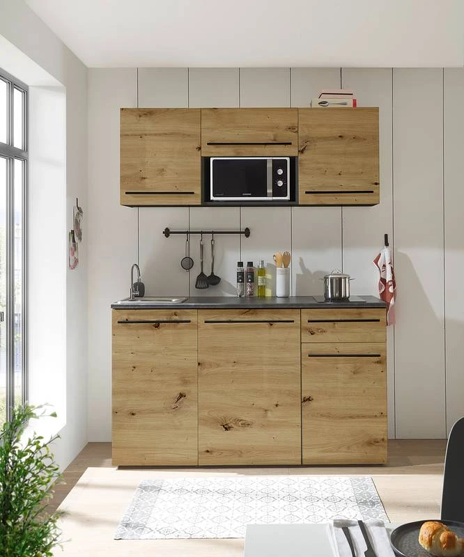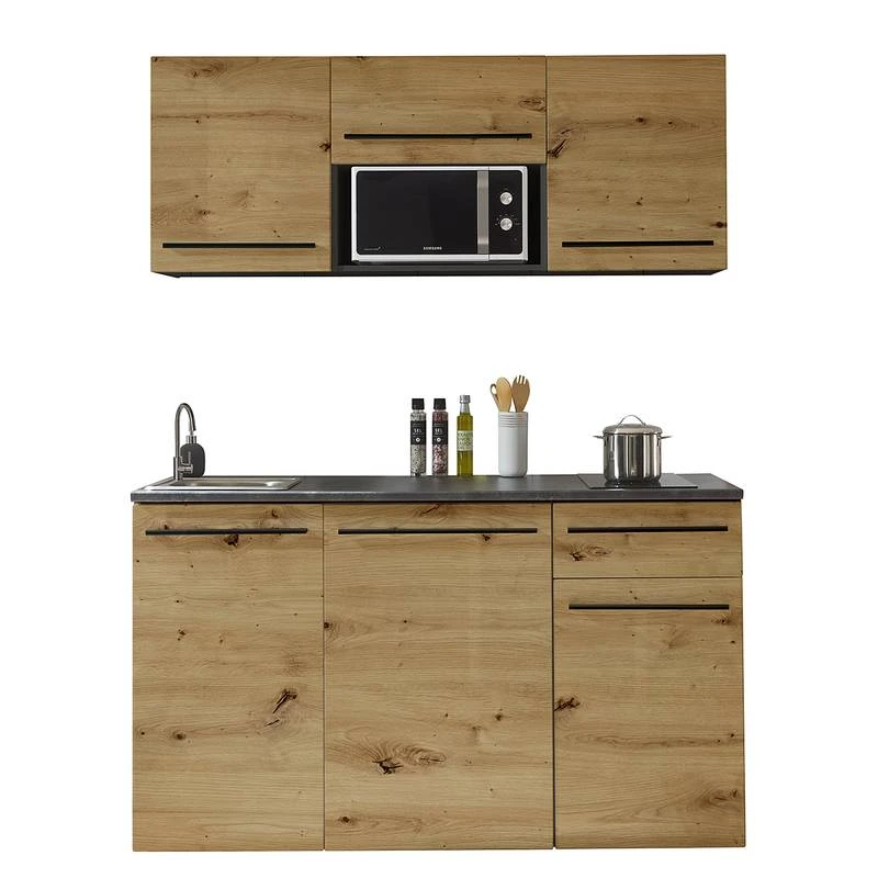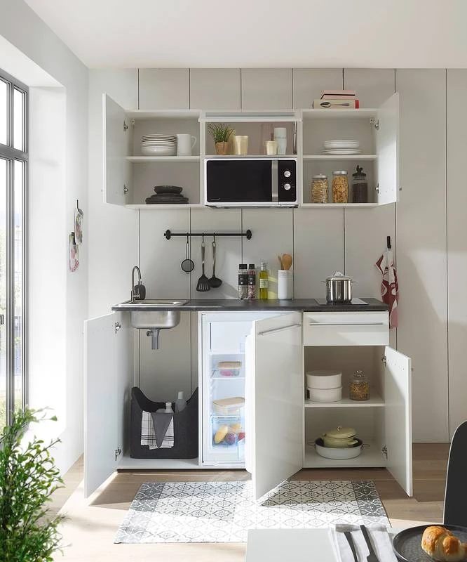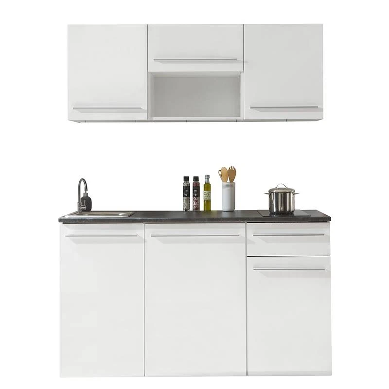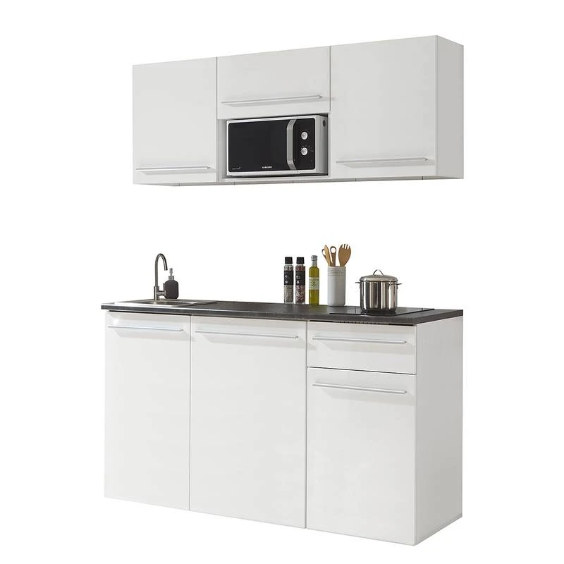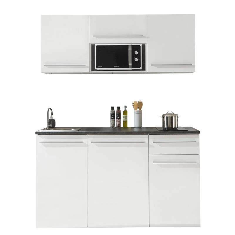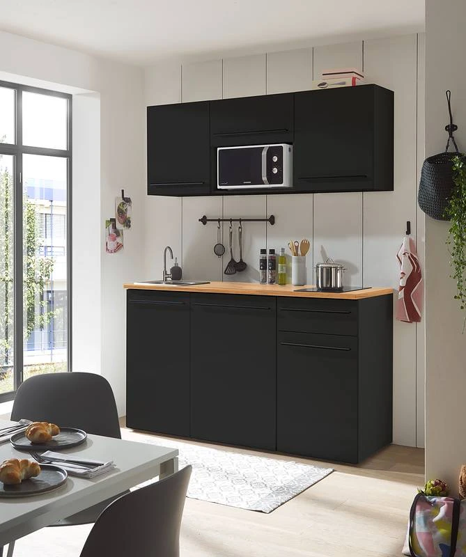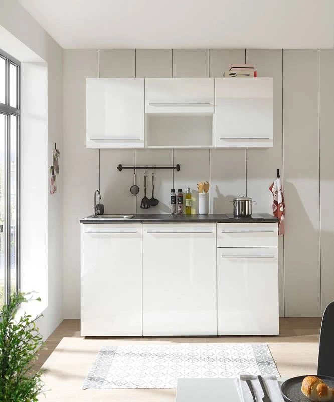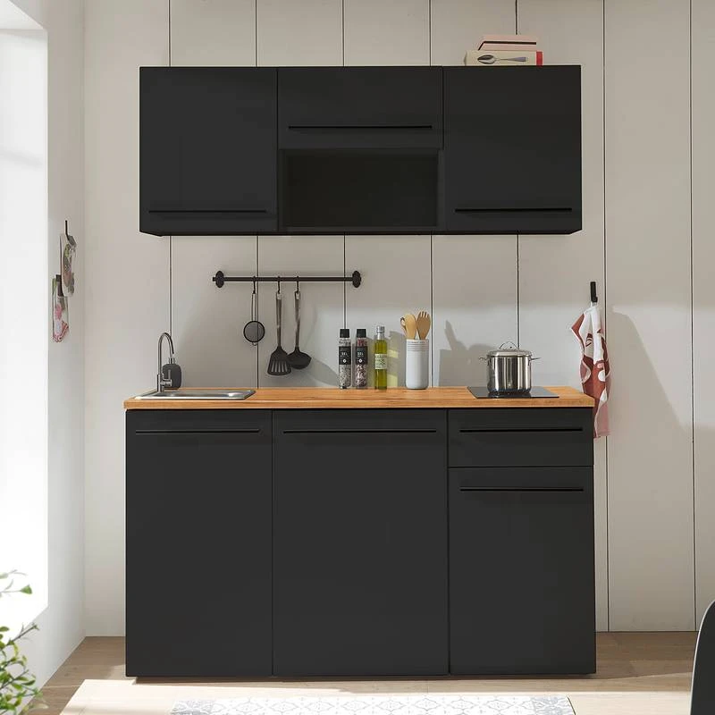 - Cuisine composée de 2 meubles hauts de 50 cm, 1 meuble haut de 60 cm, 1 meuble sous évier de 50 cm, 1 meuble bas de 60 cm et 1 meuble bas de 50 cm